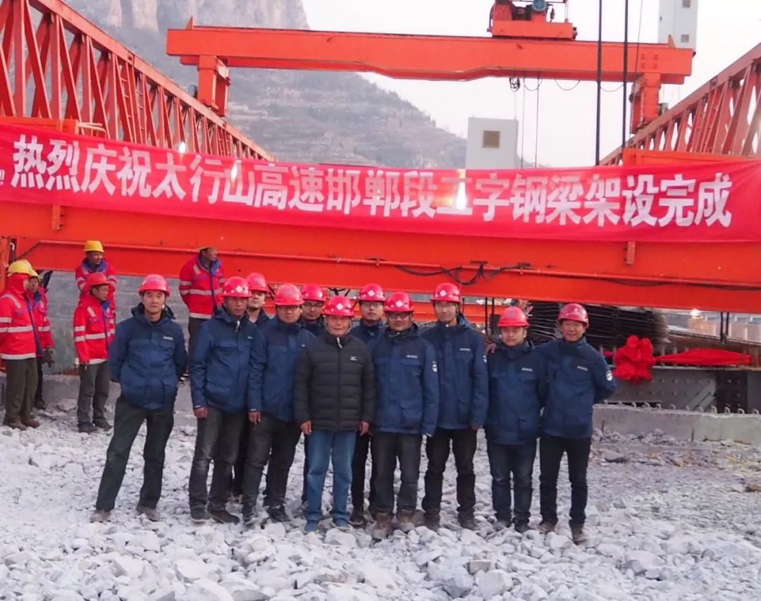 太行山高速公路邯鄲段海波重科承接內容為全線11座鋼-混組合梁大橋中工字鋼梁的制造及安裝,全線鋼結構工程量約31140噸。該項目地處太行山境內,地形、道路條件都極其復雜,施工難度巨大,工期極其緊張,工字鋼梁現場安裝工序繁瑣,現場建設拼梁場,桿件運輸至梁場后拼裝成榀,鋼梁總體采用架橋機架設,這些因素均為完成本項目的工期目標帶來了極大考驗。在面對諸多困難的情況下,海波重科總經理劉乾俊的舉動極大的鼓舞了太行項目部,這也使得太行山高速公路邯鄲段全線11座工字型鋼-混組合梁大橋的順利貫通。