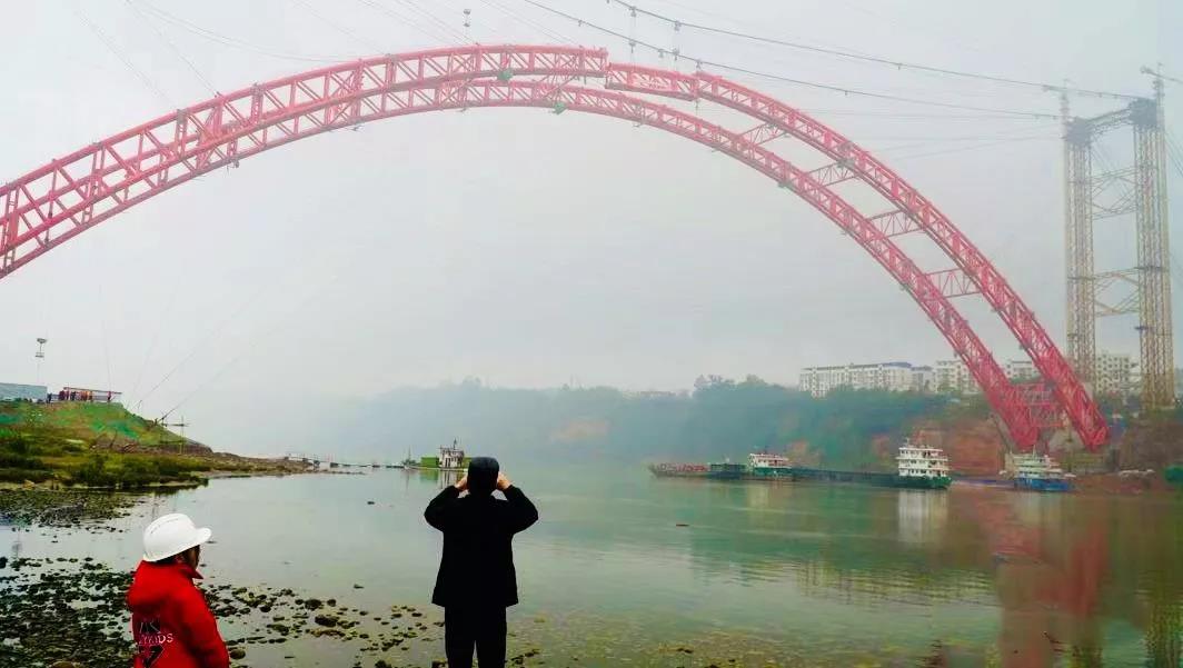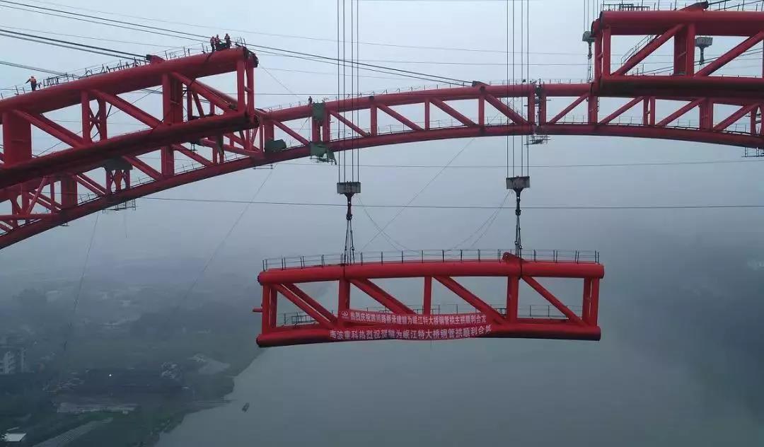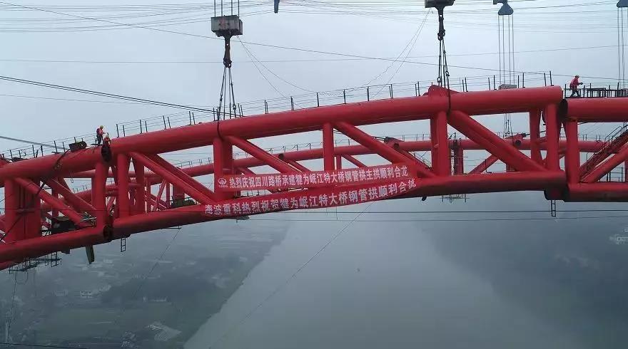 (海波重科新聞報道)2020年1月15日,犍為岷江特大橋施工現場,只見高高的吊塔聳立岷江兩岸,纜索吊裝系統已準備就緒;江面上,運輸船舶搭載著最后一段拱肋,將其運送到指定位置?!伴_始吊裝!”伴隨著現場一聲指令,拱肋從江面緩緩升起。經過1個多小時的吊裝,上午10時42分,由海波重科承接的犍為岷江特大橋主橋457.6m鋼管拱橋,完成最后一段拱肋吊裝,實現了拱圈高精度合龍,合龍精度3mm,合攏應力和全橋線形均滿足設計規范要求。