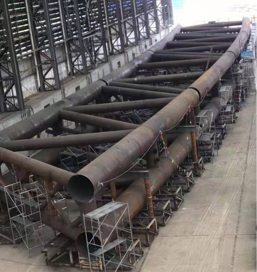 ? 犍為岷江特大橋是公司繼商合杭淮河特大橋、恩施找龍壩特大橋之后承建的又一座特大跨度鋼管混凝土拱橋,主跨457.6米,鋼結構用工程量12000余噸。項目自開工以來公司精心組織,克服了工期緊、任務重及焊接質量要求高等困難,在成熟的施工經驗基礎上不斷改進細節、提升設備能力、優化資源配置、完善工藝方案,先后攻克了Q390D-Z25厚鋼板焊接、相貫線焊縫焊接及修磨、拱肋節段臥式拼裝工藝控制等技術難題,優質高效的完成了主拱肋首輪節段制造和試拼裝施工,為鋼管拱按期合龍奠定了堅實的基礎。