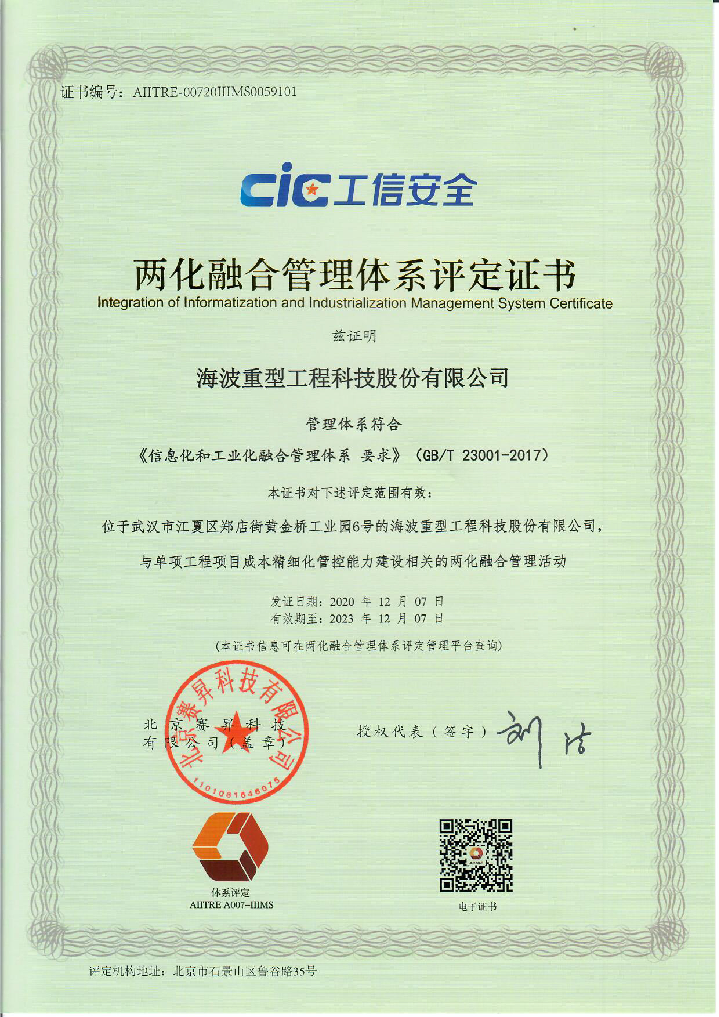 最終,經國家工信部認可,我公司兩化融合工作符合國家兩化融合管理體系滿足標準要求,同意頒發“兩化融合管理體系評定證書”,標志著海波重科兩化融合管理體系貫標工作圓滿完成。